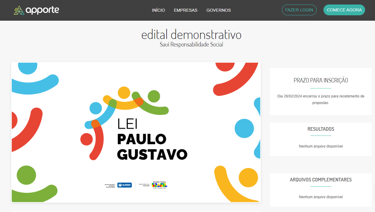 Apporte é uma plataforma de gestão de editais e chamamentos públicos (social, cultural, esportivo, startups, etc) que facilita a rotina dos usuários, gerando economia de tempo, segurança e mais governança nos aportes das empresas e governos investidores.